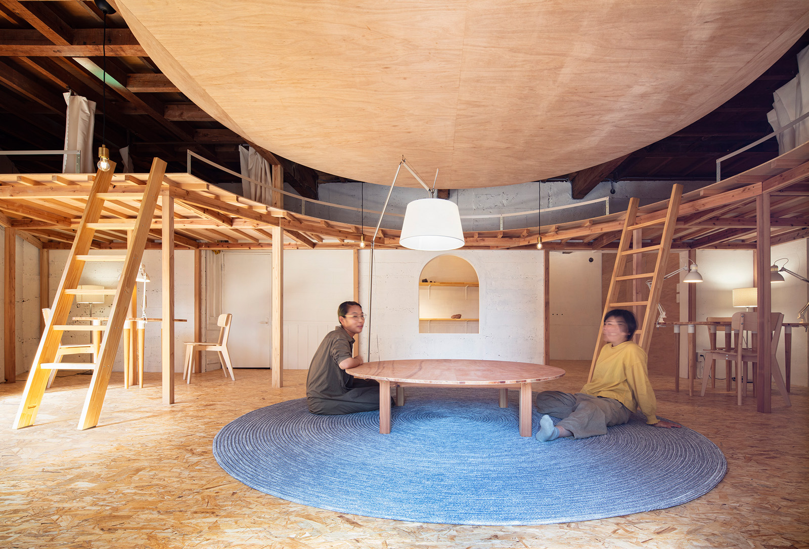 ロフトベッドと呼ばれる、机とベッドが一体となった家具を「スタディ」のモチーフとして、円がくりぬかれた形のロフトベッドを設け空間の骨格をつくった。ロフトの下には勉強机が、ロフトの上には厚いカーテンで間仕切られた寝床が人数分用意されている。
