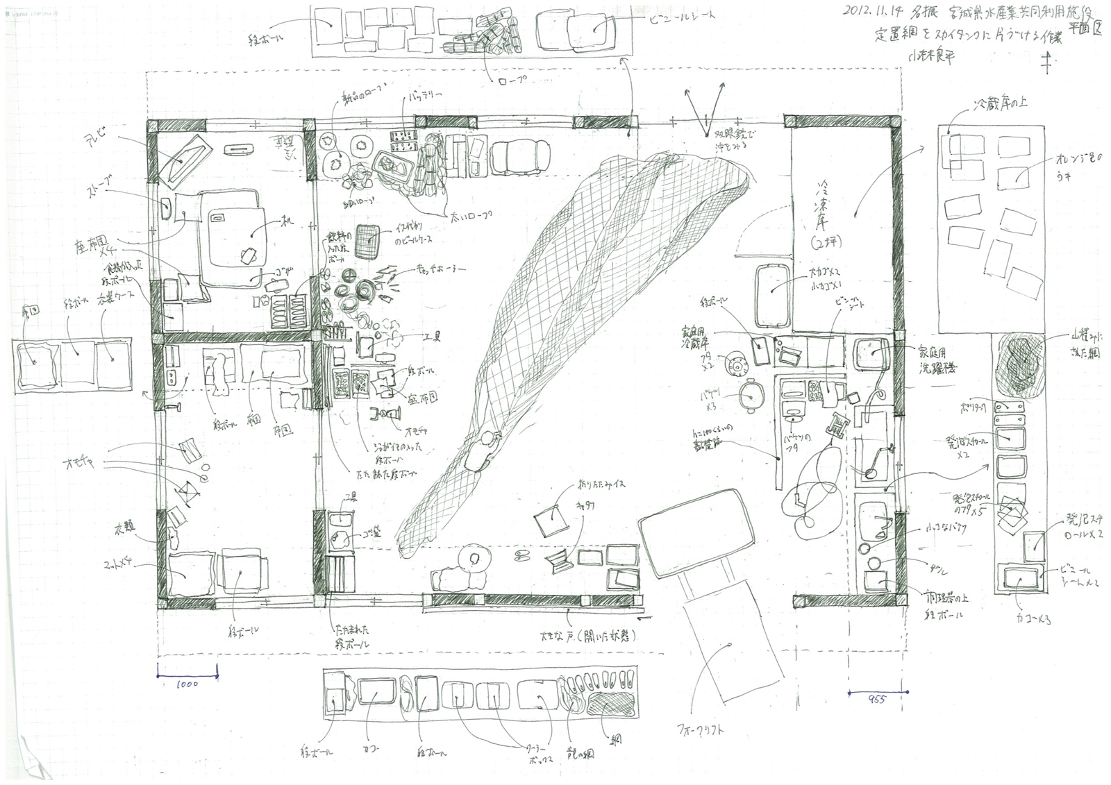 1つ目は漁師小屋の調査、研究、設計です。東日本大震災の被災地である宮城県石巻市雄勝町では、津波の浸水域に家を建てられなくなり、主に漁業の小屋が建設されています。それは戦後のバラック建築のように、ありあわせのものでつくった必要最低限度の造りでしたが、復興という厳しい状況で格闘する美しさがありました。私はそれらをサポートしたいと考え、2012年から2018年にかけて調査し、漁師小屋の図面やヒアリングをA3の紙に236枚描きました。