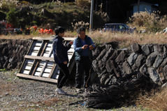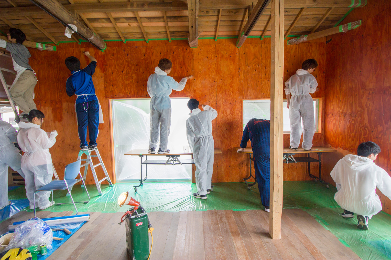 ▲大学生と壁に柿渋を塗る様子。(クリックで拡大)