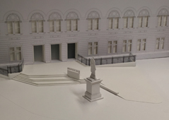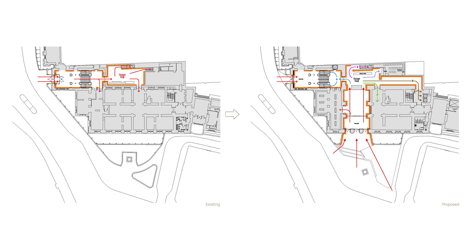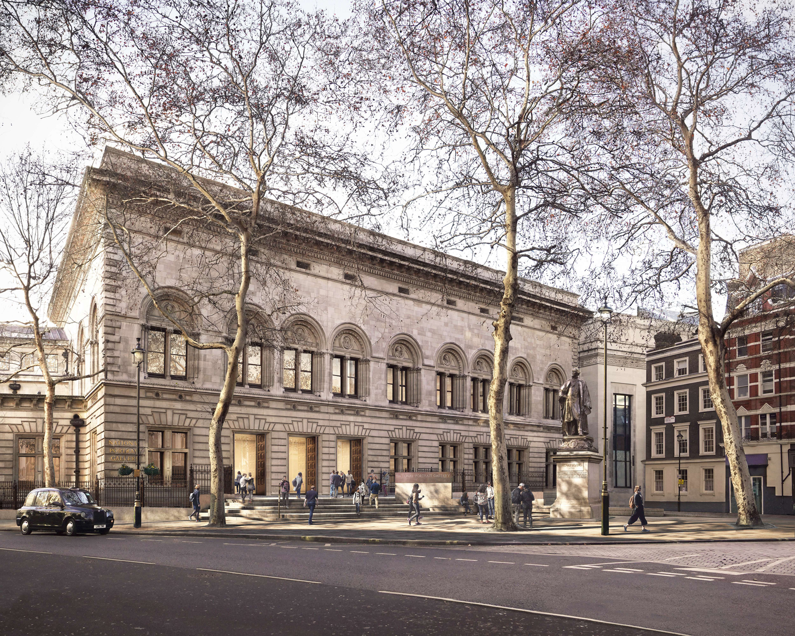 第一級保存建築登録(Grade I listed)されている既存建物に対して我々は、通常は保存すべきファサードを構成する地上階の3つの窓を取り除き、新しい入り口として作り変えた上で、その前方にスロープ状の街へ開かれたアプローチ兼広場を提案した。当初は建物のファサードの一部解体し、開口部を本来と違う意味合いへ変更する案に行政や建築保存活動団体から激しく否定された。しかし、建物を取り巻く環境は19世紀から大きく変化していること、ロンドンの中心に新たな広場が生まれる事の革新さ、新しい動線や平面計画との整合性、そしてこれから先の歴史を作る建物として存在していくための最善の方法がこの案であることを解き続けた。