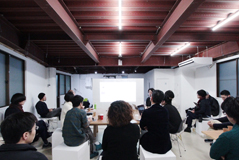 ▲写真1:アンビエントデザインズのオフィスを会場として開催された対話型企画《「物質」と「出来事」から考える建築》の様子。ゲストは建築家の設計による集合住宅の管理人、デザイン事務所主宰者など、デザインのつくり手とつかい手を横断するように計画された。(クリックで拡大)