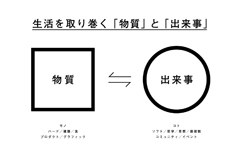 ▲写真2:「物質」と「出来事」の関係性を表したダイアグラム。対話型企画の冒頭でも前提の共有として用いていた。(クリックで拡大)