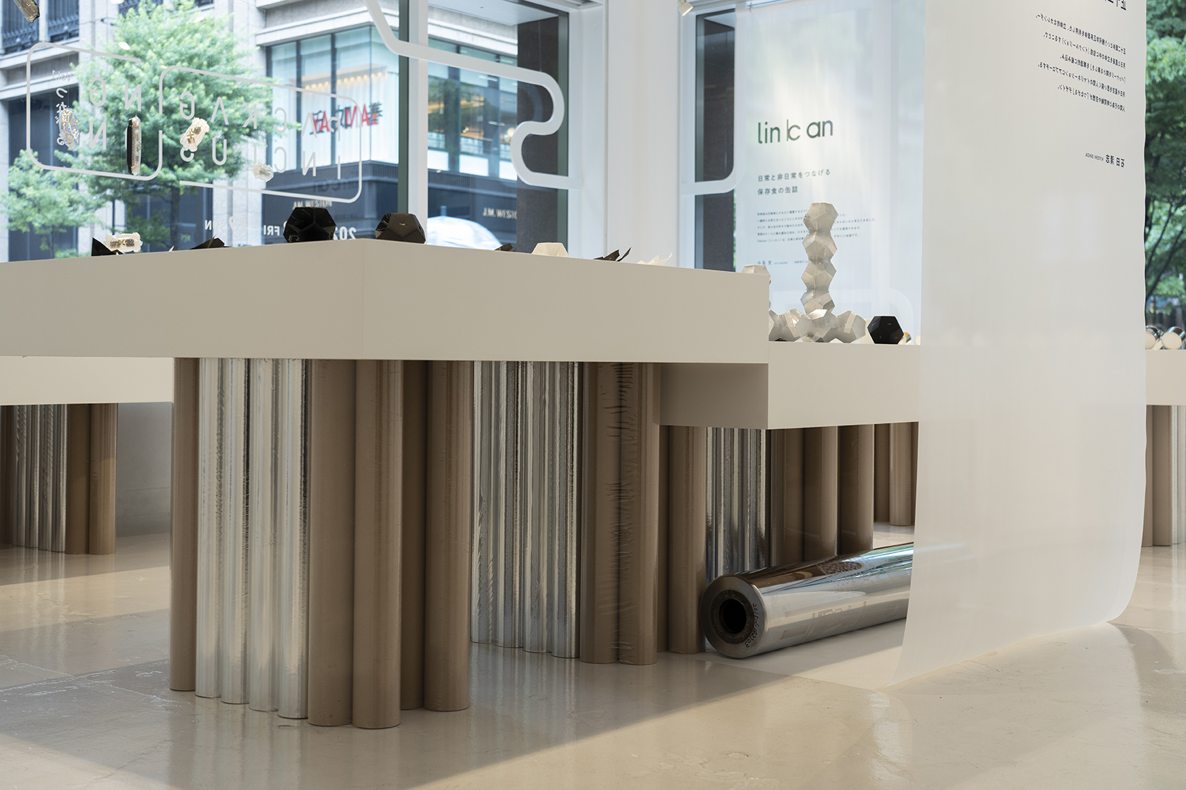 僕は展示会の会場構成を担当させていただいた。しかし企画段階ではプロトタイプの開発を行っている最中で、直前になるまで展示物が未確定であった。そこで唯一決められていた、両社の素材と技術を使うという条件を会場構成にも取り入れ、展示台の脚部にクルツの箔を巻きつけた紙管を活用。数本をフジシールのシュリンク技術で包装することで強度を生み出し、展示什器として配置する構成とした。