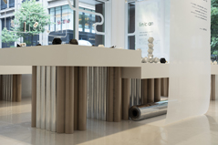 ▲箔を巻いた紙管をシュリンクした什器の脚部。Ph:Daisuke Ohki。(クリックで拡大)