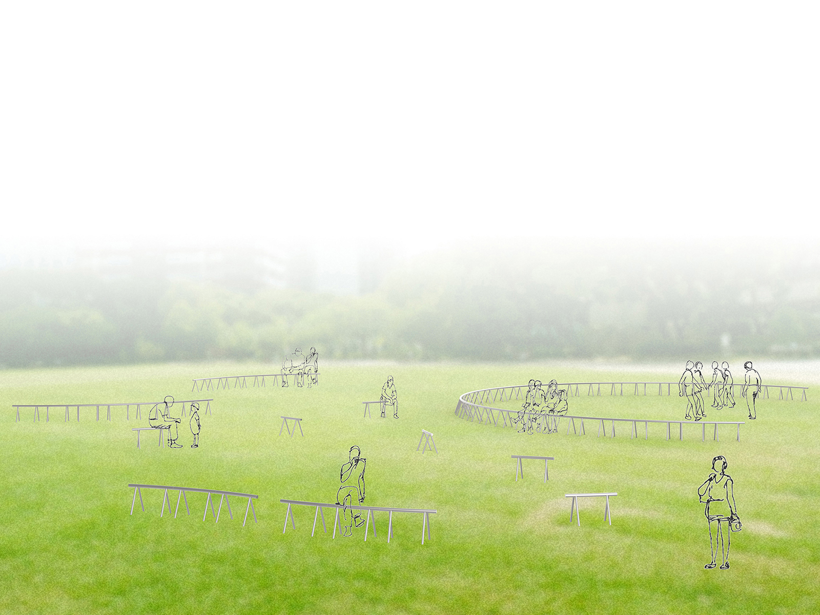 その公園のリニューアルにともない「東遊園地の座具製作コンペティション」という公募のデザインコンペが行われた。僕は椅子ではなく「座具」という言葉をテーマとして掲げている点にとても共感を覚えた。そこで、将来性や柔軟性も考慮し、仮設足場などで使用される単管と同じ太さのパイプで構成された座具を提案した。