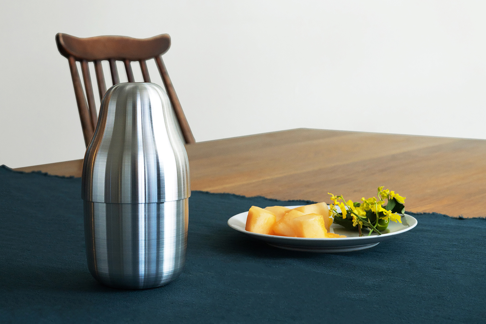 ユニットでの初仕事は、富山県のアルミ製のフライパン、鍋メーカーからの依頼だった。富山が誇る高度な金属スピニング(絞り)技術が合わさった、食卓を彩るマグセットを制作した。底から口へ広くなる曲線型の上マグと、ストレート型の下マグの上下5セットが入れ子になって収納されている。飲み物や人数に合わせて好みのサイズを選べ、テーブルインテリアとしても愛らしいモチーフに設計した。