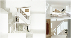 ▲fig.2:滋賀に計画した「袋小路の家」建築と家具の境を曖昧にする階段と大机、日常的な居場所となるサンルームのような階段室。(クリックで拡大)