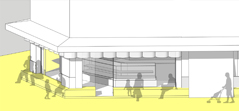 田辺駅前は3本の道路の交差点になっていて、建物はカットされたケーキのような形(fig.5)で、そこからさらに鋭角が隅切りされて3面が歩道に面しています。こうして見ると都市に引かれた線の多くは、より上位の計画からのオフセットであることが分かります。この3面合わせた間口の広さに対して、外周をまわる約11mの長いベンチを計画しました。このベンチもまた外壁から外側への、また交差点から内側へのオフセットです。建物に取り付いているようにも歩道から生えているようにも見えるものを目指しました(fig.6)。