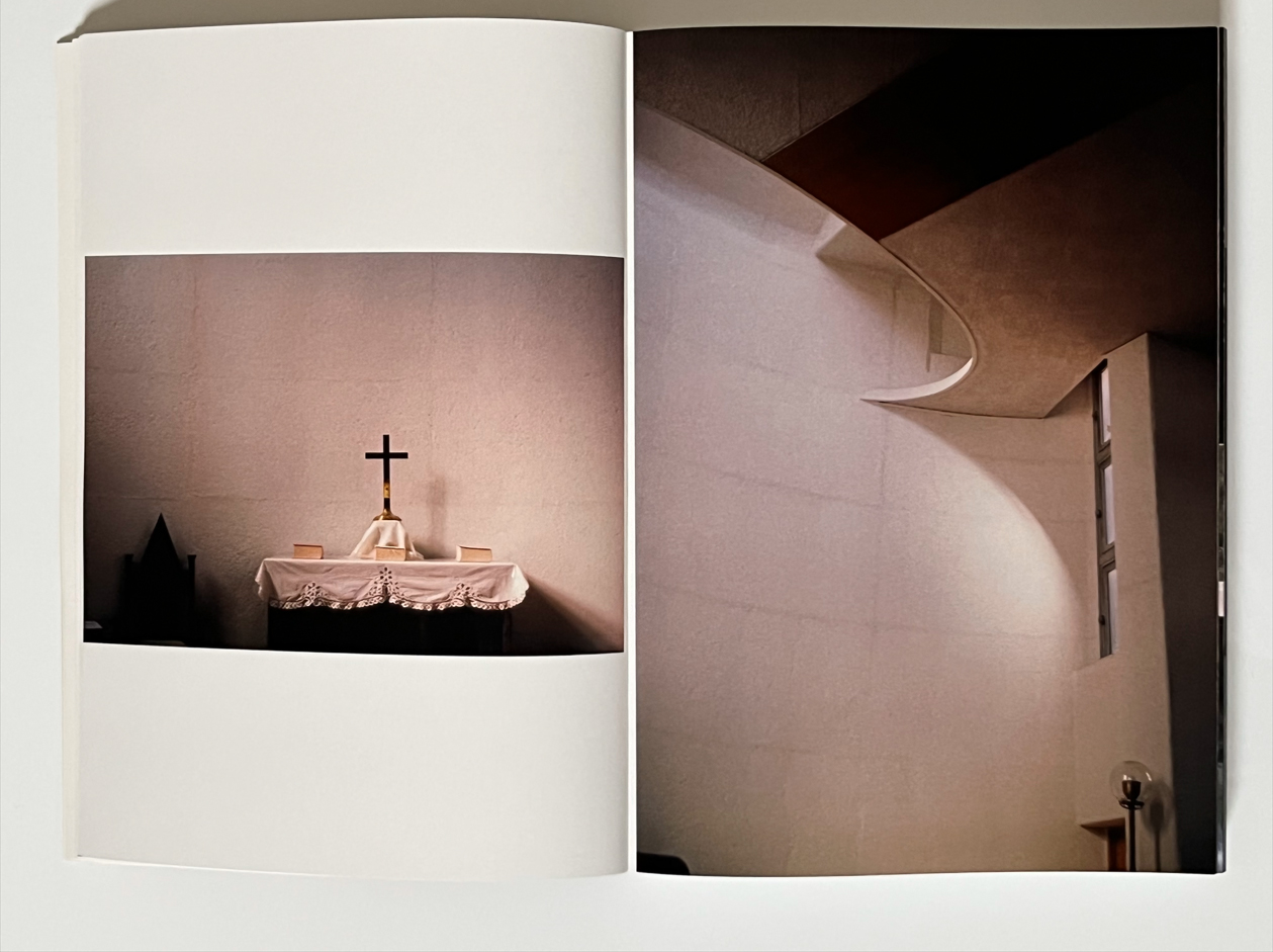 設計をすることだけでは考えなかったことや写真を撮ることを通して考えたことが、もしかしたら設計の仕事の主題の1つになるのではないかという予感から、ここでは建築を作ることや経験するということを写真という別領域から考え直すきっかけになればと思う。 本書の写真は三脚や照明などの撮影機材は使わず、すべてフィルムカメラで撮影している。大量の図面をカバンに詰め、オリンパスペンを片手に、街の中でスナップを撮るように撮影した。 オリンパスペンというカメラは、1960年~1970年頃に流行、1枚の写真が35mmフィルムの半分サイズのため、1本のフイルムで倍の数の写真が撮れるという特徴がある。それが、家庭用のスナップにぴったりで当時はアマチュアに好まれて使われていたようだ。また、普通にカメラを構えて撮ると写真が縦向きになるため、ポートレートにも向いており、流行の後押しにもなったようだ。 本書に収められている写真群は、建築雑誌に掲載されている写真とは違い、空間に対してどこか「距離の近さ」のようなものを感じる。それをひとまず「建築のポートレート」と呼んでみたいと思う。 ●「距離」と「視線」の問題 ポートレートというのは、自己(撮影者)と他者(被写体)の距離感が表象される手法だと言われており、写真における重要なテーマの1つでもある。牛腸茂雄による『SELF AND OTHERS』の写真は、どこか被写体との「距離の遠さ」を感じてしまうし、それに対して、野口里香の『父のアルバム』の写真には被写体の「距離の近さ」を感じる。 それは、単なる対象者との親密さや家族関係といったような社会的な関係とは切り離された、写真世界が作る独自の「距離」が生まれているのではないだろうか(牛腸のポートレート写真の中には実兄弟が含まれている)。このことを写真が持つ「距離の問題」と捉えてみる。 また、ホンマタカシの『THE NARCISSISTIC CITY』はカメラオブスキュラを用いて撮影している。カメラオブスキュラとは、ラテン語で「暗い部屋」の意味で、カメラの原理そのものである。 カメラが開発される以前は暗室に針穴を開け、そこを通る光によって写し出される対象物を壁面に投影し、それを下絵に風景の模写が行われていた。ホンマはこの原理をビジネスホテルなどの都市の建築物の中で行っている。これにより撮影した写真が示唆しているのは、建築というのは新たに視線を作り出す装置になり得るということではないだろうか。これを空間が持つ「視線の問題」とする。 以上の「距離と視線の問題」として建築を捉えてみたい。建築雑誌のように建築を説明するための写真ではなく、写真から建築を考えた時、建築はどのような風景=「距離と視線」を作り出せるのだろうか。本書の制作を通じて、このような興味が生まれてきた。 ●建築のポートレート -建築に近づいたり遠ざかったりして見る。あるいは、建築以外を見ること- さて、唐突ではあるが「建築の経験」とはどこから始まってどこで終わるのだろうか。この問いは前述した「距離と視線」の問題を孕んではないだろうか。 建築の内部に入ったとき(あるいは建築が視界に入ったとき)から、その建築を見終えるまでを「建築の経験」というのだろうか。また、建築には必ずコンテクストがまとわりつく。この状況は空間的にも社会的にも存在していると言えるだろう。 空間的とはいうまでもなく周辺環境である。建築を建てるということはそれが設計者の意識的か無意識的かに関わらず変化するものであり、社会的とは、それが建てられる背景や歴史である。ここでは特に空間的なコンテクストに着目したい。以下は、村野藤吾の建築を撮影していく中での個人的な体験ではあるが、「距離と視線」の問題を考えるきっかけになったものである。 ●村野藤吾の作例 小山敬三美術館は懐古園という小諸城跡公園内にあり、千曲川に臨む標高650mの断崖の上に建っている。 本多静六によって設計された園内の林に溶け込みような形状をしており、参道から歩いてくると木々よりも建物の高さの方が低いため、十分に近づかないとはっきりとした輪郭が見えない。きのこを連想させるような屋根形状や、全体的な曲線は建築内部にも続き、生き物の体内を思わすような村野藤吾のユニークな造形感覚である。 しかし、この建物で一番印象付いているのは、その帰り道である。ある程度建物全体を見終えて、次の目的地に移動している時ふと振り返ると断崖から美術館が見えるのである。その時、その場で完結していた建築の大らかな経験が、一気にこの広大な土地を覆うように拡張されたような感覚がしたのである。