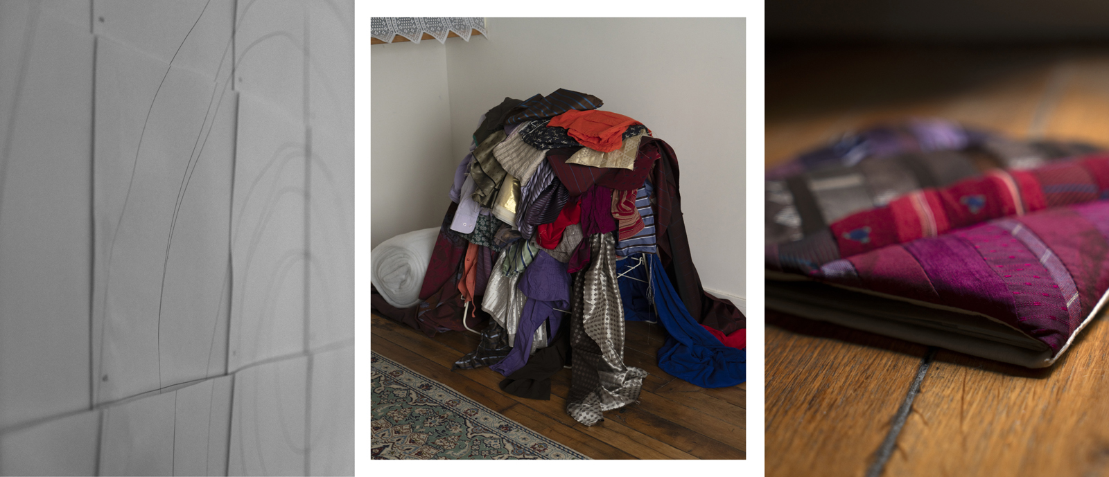 サンスクリット語でmanda=本質、心髄、醍醐(発酵の最上級)を意味すること、彼らの複雑で没入的な音楽のイメージからもヒントを得て、多くの生地を縫い合わせ1つにしながら模様を作りだすパッチワークを選択しました。デッドストック生地や古着、友人やさまざまなところからも生地の端切をかき集めながら製作しています。
