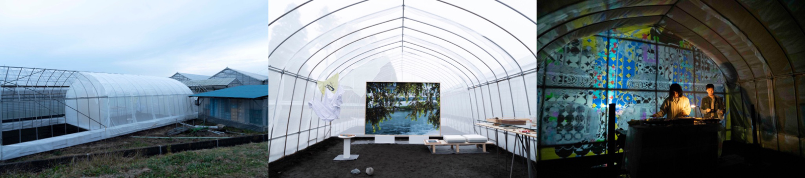 少し前に、友人たちとhouse in da houseという音楽を含めた展示のイベントを企画したことがあり、実験的にですが少しだけハウスの会場が実現しました。実家で使われなくなって放置されていたハウスの骨組みを利用して、透け感のある布地でハウスを包み、スプレーマムのビニールハウスが立ち並ぶ中、ビニールハウス型の会場を作りました。