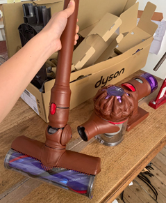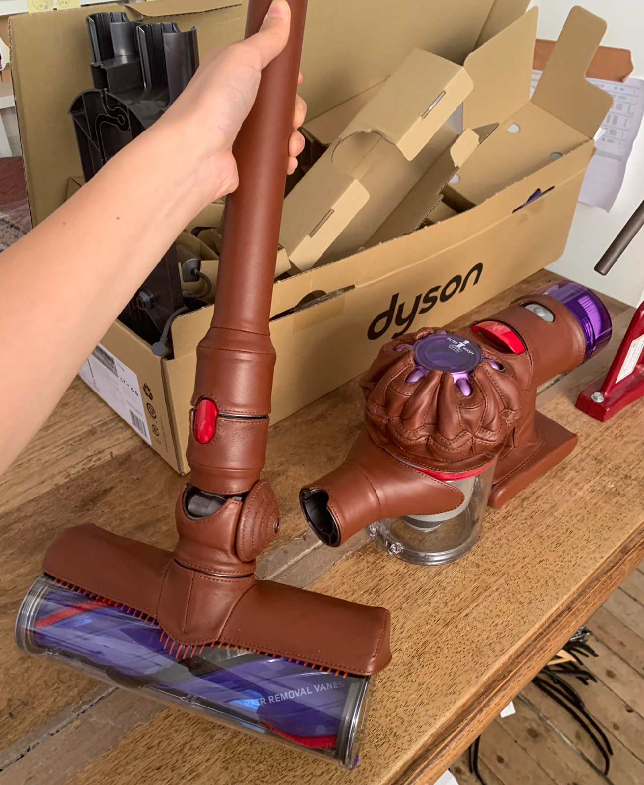 現在私がモデリストとして働かせていただいているBLESSは、インターンからお世話になっています。働き方やその精神など含め、いろいろな意味で大好きでとても尊敬しているブランドの1つなのですが、あるプロジェクトで、Dysonのレザー化を担当したことがありました。以前にも掃除機や箒、スプレーボトルやペットボトルなどさまざまなものをジーンズ化してきましたが、Dysonをレザーで包むというのはパーツのパターン作りから複雑でとてもやりがいがありました。