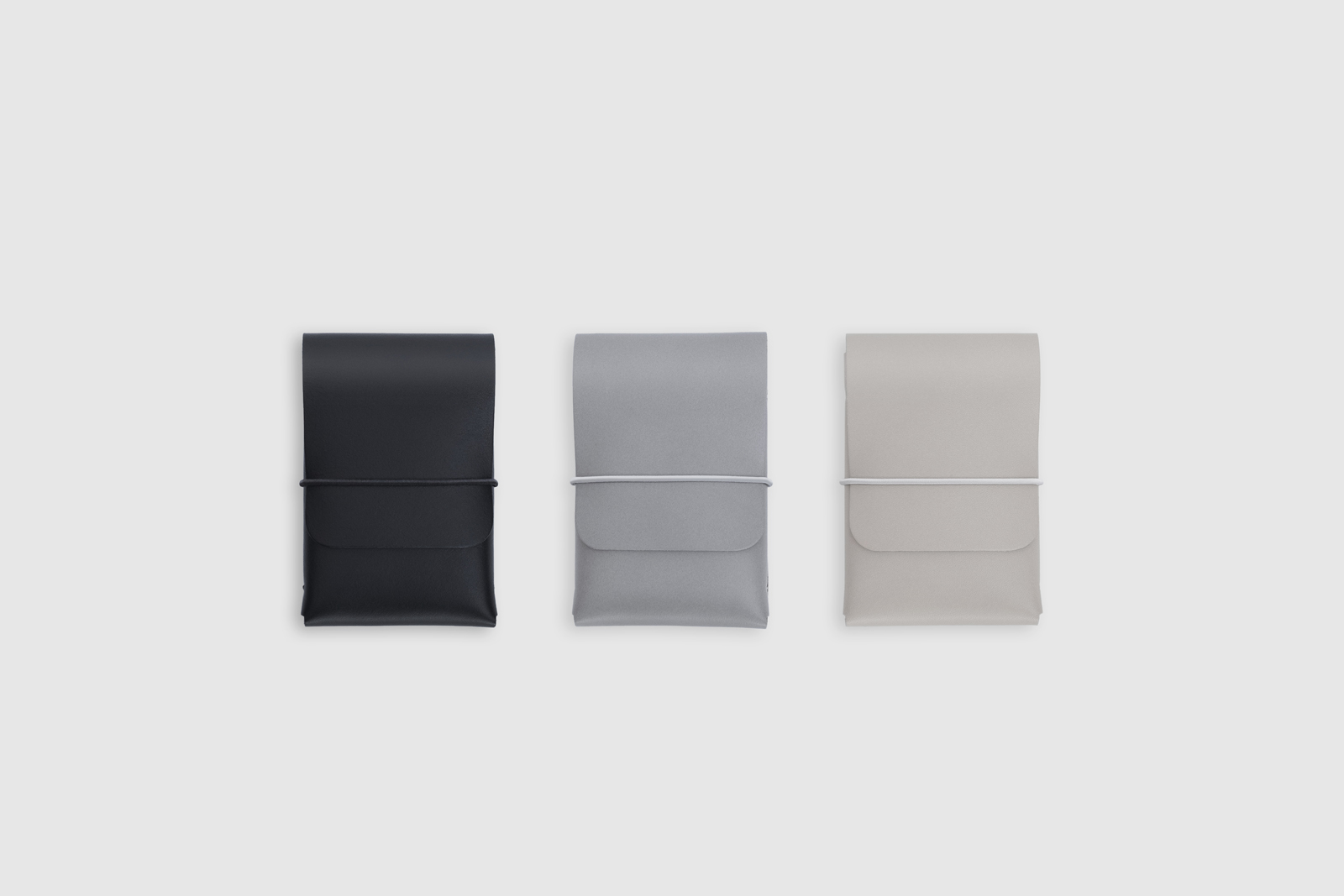 ▲1枚の革を折りたたんで、硬質パルプとゴム紐、最小限の縫製でできたユーティリティケース。(クリックで拡大)