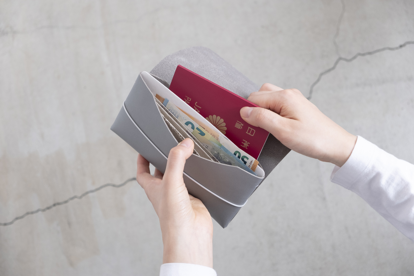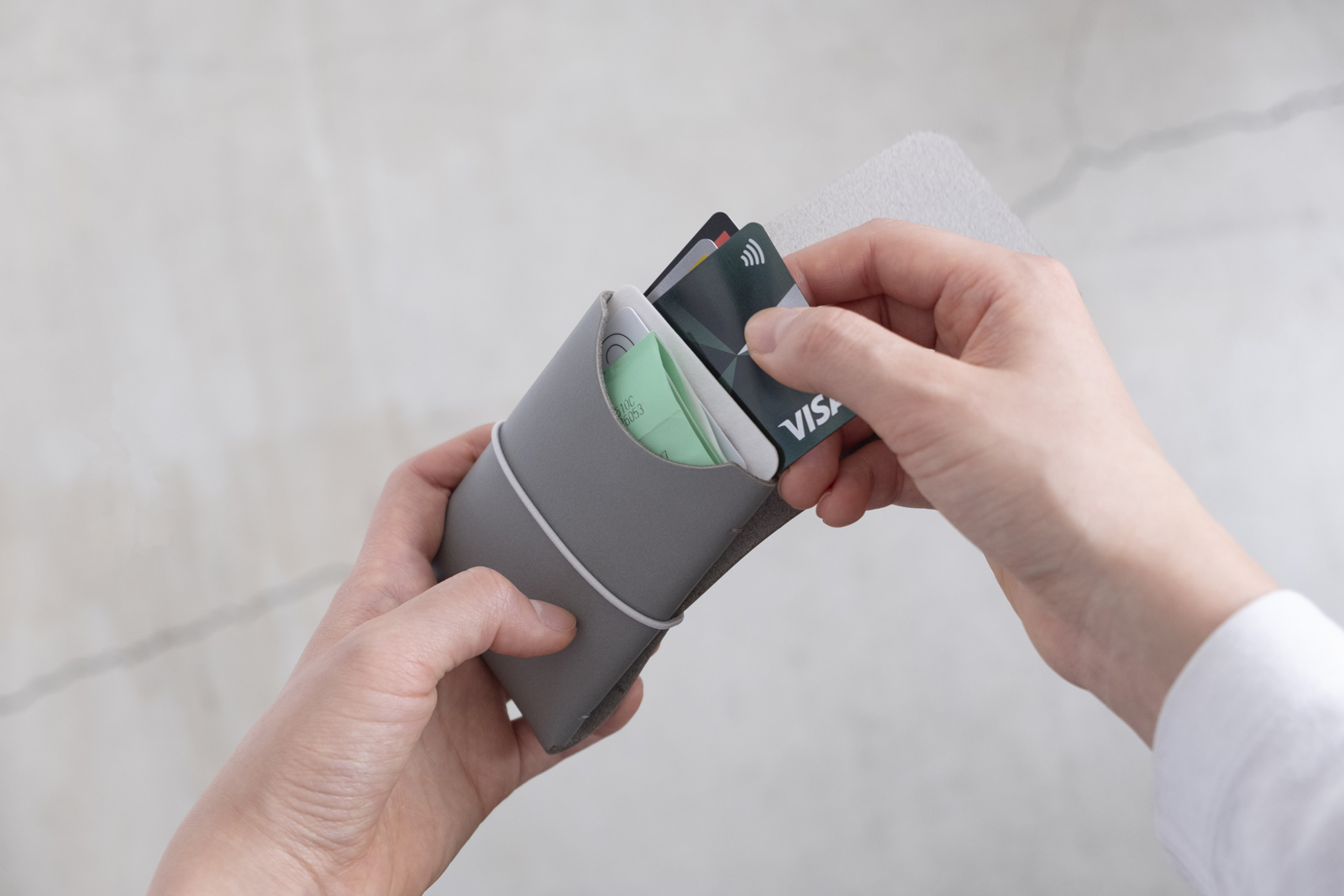 ▲1枚の革を折りたたんで、硬質パルプとゴム紐、最小限の縫製でできたカードケース。(クリックで拡大)