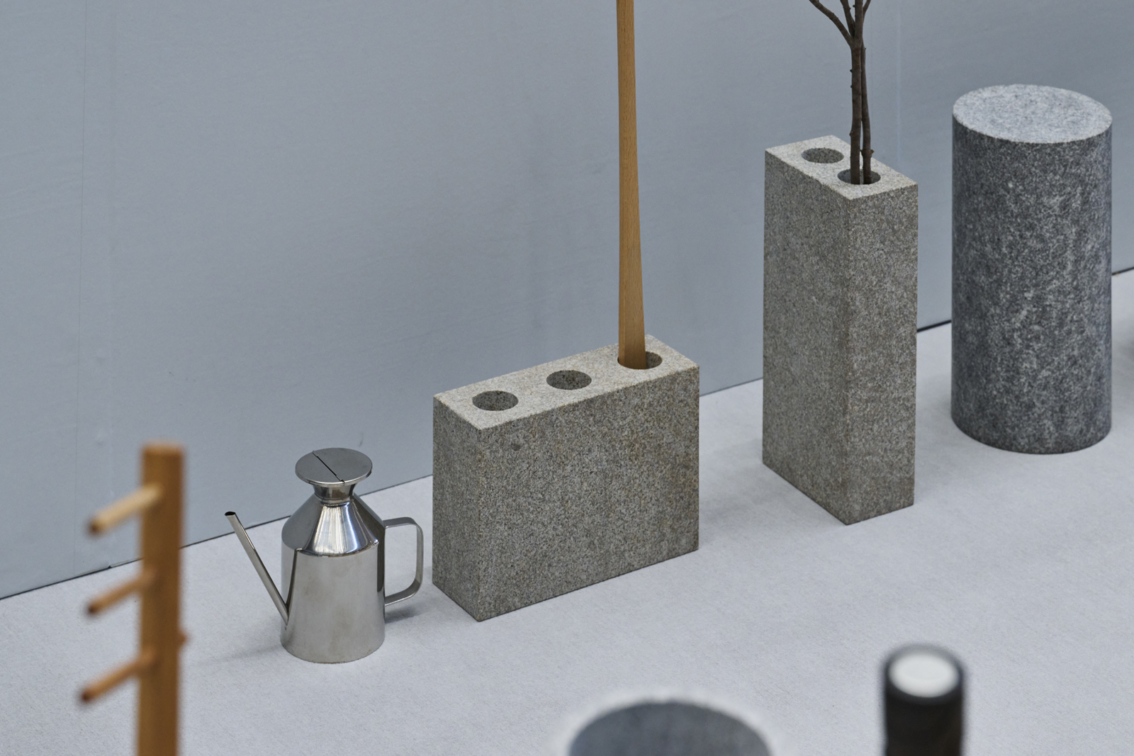 庵治石は、香川県高松市で採石される石で、石材業界では日本一高級な石と言われることもあります。目が細かく耐候性も高い石材で硬質なため、加工にも高い技術が必要です。NC切削などの加工環境はなくほとんど彫刻の域です。そのため、素材としての価格も高く、加工費用も高くなってしまうので日用品に置き換えようと思うと、用途と価格のバランスが取りにくく、プロダクトに用いるには、とても難しい素材だと感じました。石という素材に新たな役割や意味を与える方法を模索し始まったのが「READY MADE」と「OMORI」というプロジェクトです。