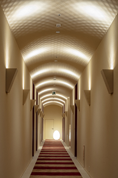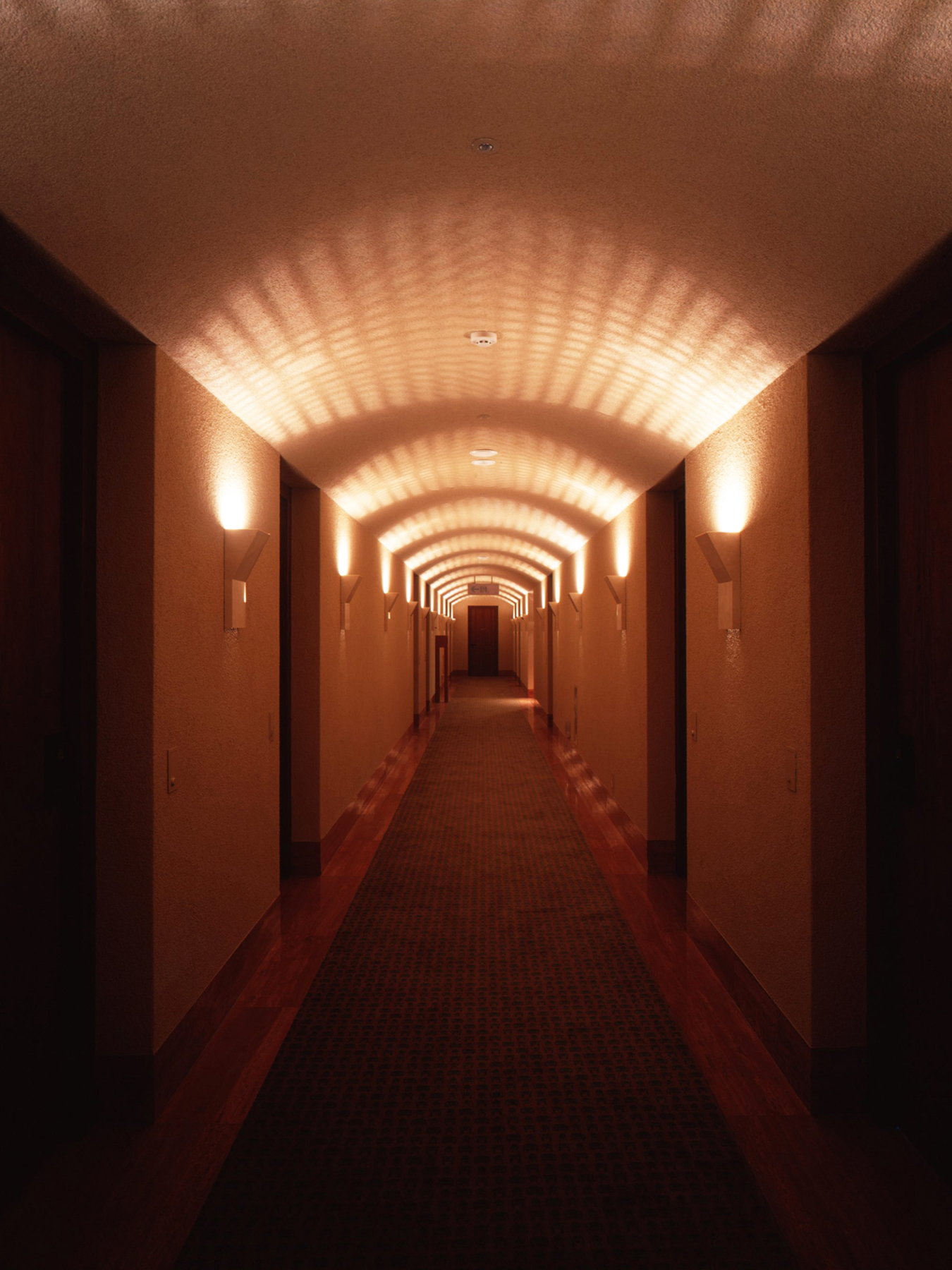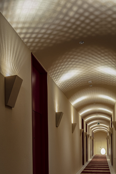 1989年当時の客室廊下は、アーチ天井にブラケットライトから伸びた格子の影が美しく映し出される構成で、ミニマルでありながら装飾的でもある印象的な廊下でした。今回の改装のテーマが[リ・デザイン]ということもあり、イルパラッツォの重要なエレメントであるブラケットライトを同じ位置に新たに設計することになりました。