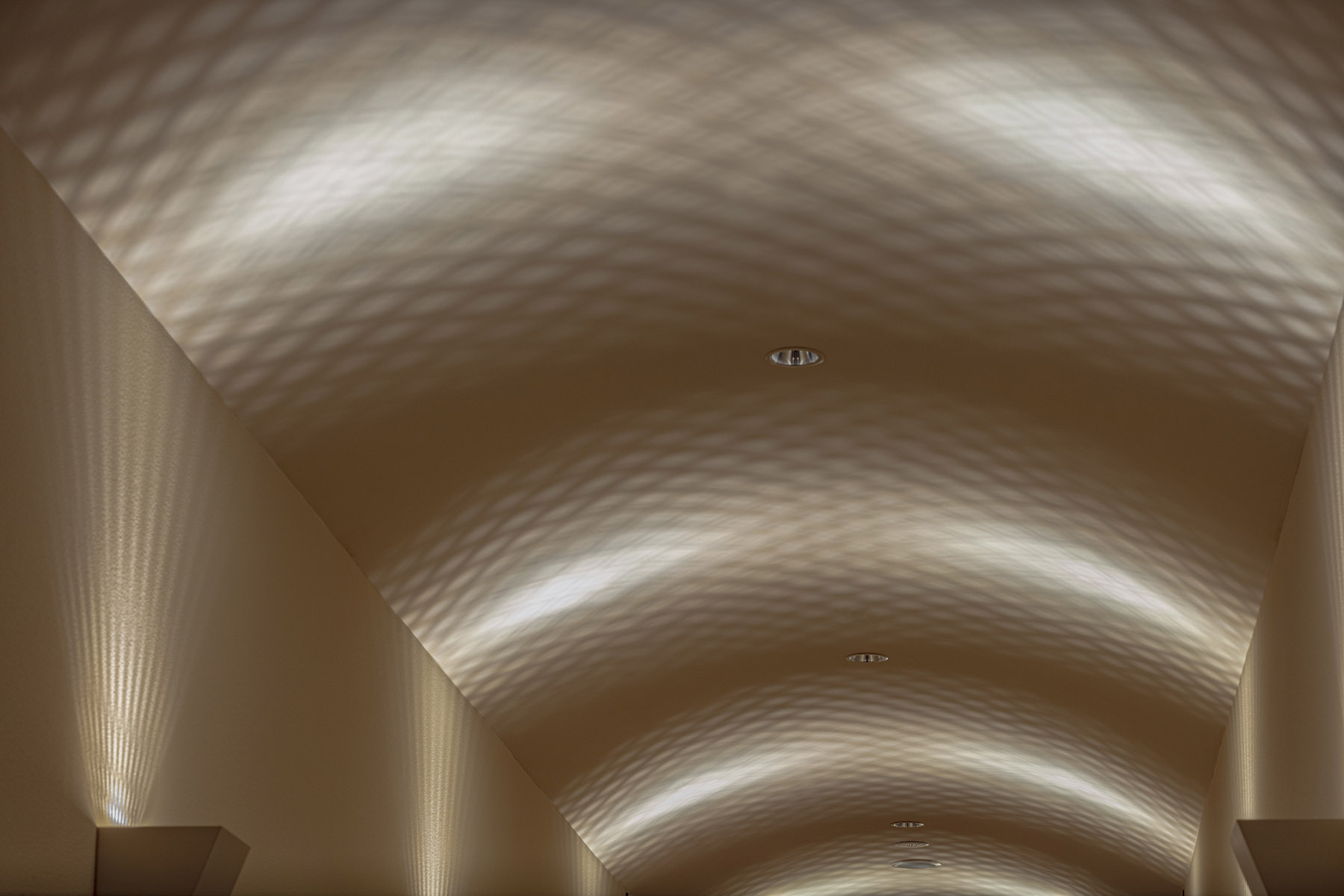 実験を繰り返す中で、格子を45°振った方が複雑な影になることが分かりました。45°振ることで、壁に映し出される光がダイヤ型となり、アーチ天井に映し出される複雑な格子のラインが廊下を包み、全体をラグジュアリーな印象に仕立てたと思います。たったこれだけの処理でこうも印象が変わるのか、という驚きは自分の中で大きかったです。