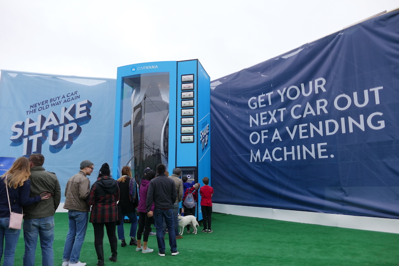 写真は、SXSWの開催地であるテキサス州オースティンで中古車ディーラーを営むCaravanの「あなたの次のクルマは自販機で買おう」という屋外プロモーション。さすがにこれはダミーだが、実際にも商談後に専用コインを渡されて、それを入れると全自動で購入した車が出てくるガラス張りの5階建てガレージで他社との差別化を図っている。(大谷)