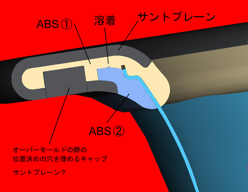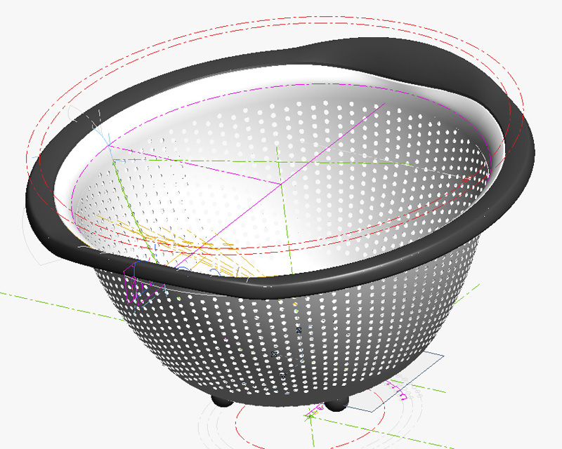 ハンドル部(エラストマー)と金属部(ステンレス)がインサート成形による一体のデザイン。アセンブリの状態で図面を作成し、部品図に分けてファイル形式を変換し製造工場へそのまま出図する(クリックで拡大)