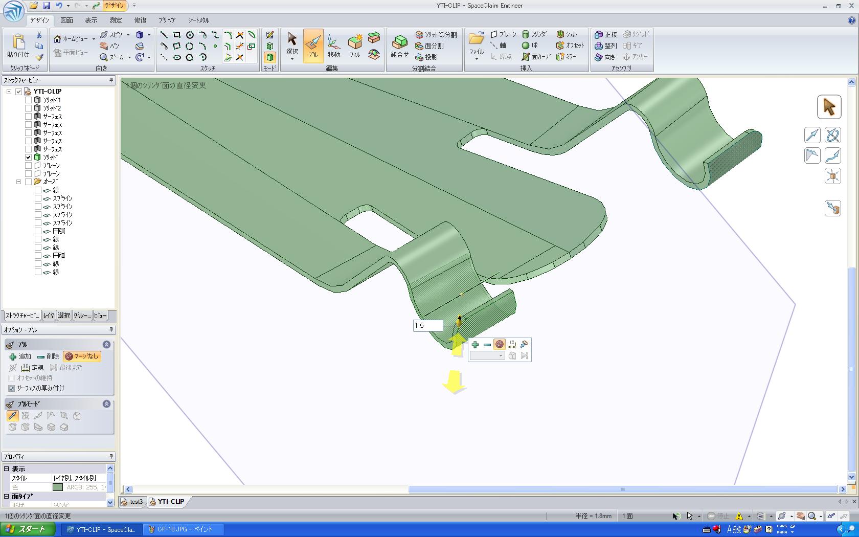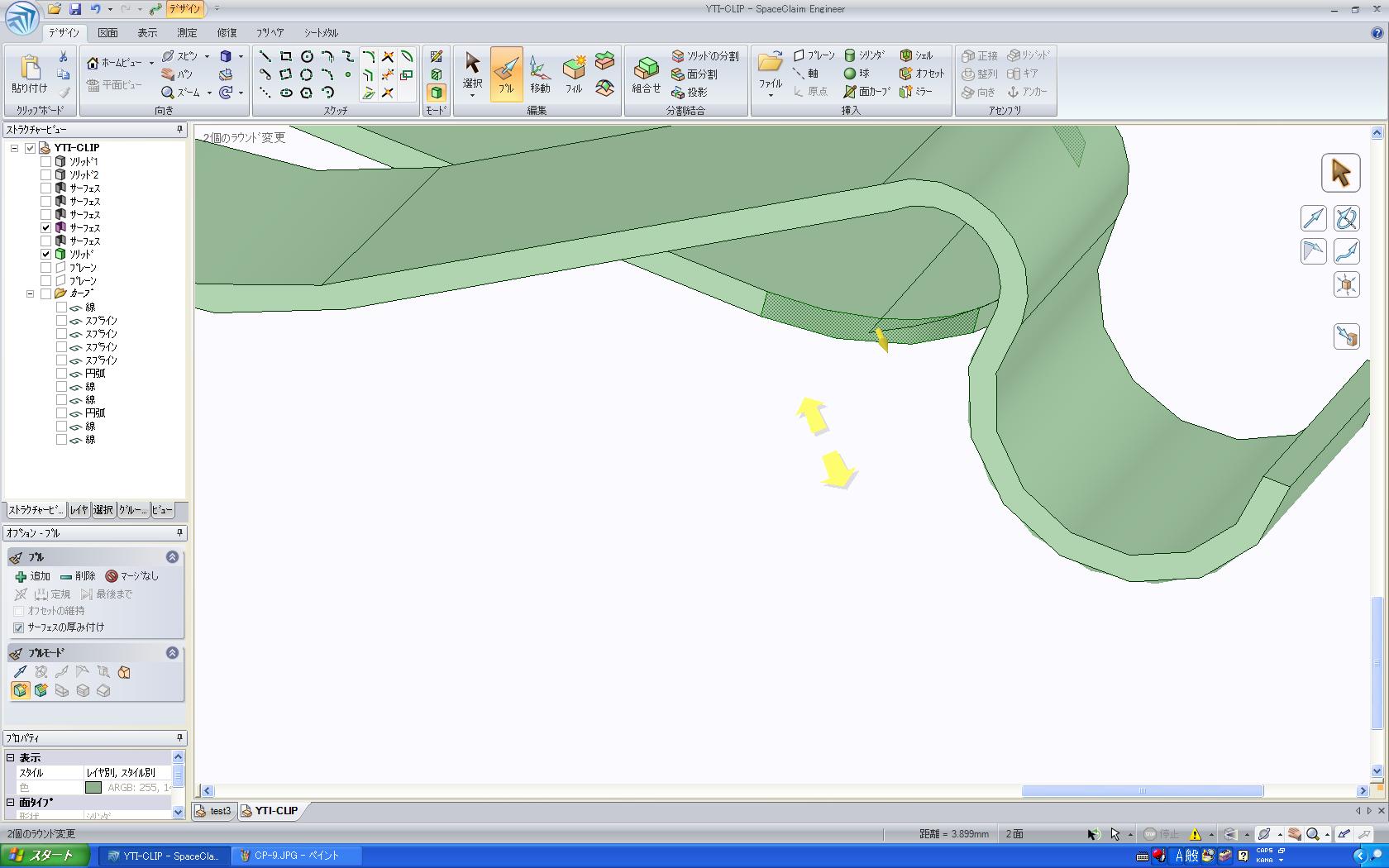 画像4:曲率は、デザイン−選択−移動、で制御点を移動することにより編集可能。Space Claimではパラメータを持たないため、移動方向によって、正接の条件が無くなる事があるが、再度定義することができる(クリックで拡大)