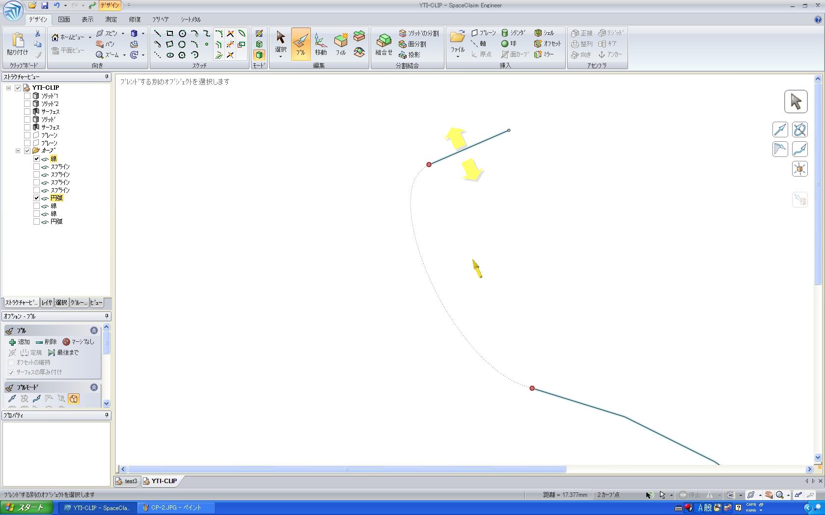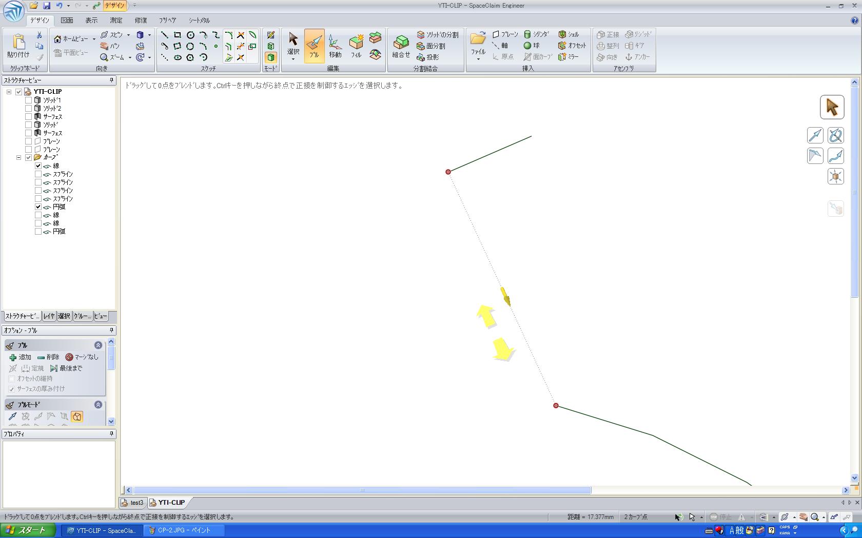 画像2:次に、空間上に定義された曲線の両端に正接する曲線を定義する。この場合、デザイン−編集‐プルを使う。これ以後このツールのみで形状を作ることが可能。まずAltキーを押しながら曲線の両端点を選択すると、2点をつなぐ直線がプレビューされる(クリックで拡大)