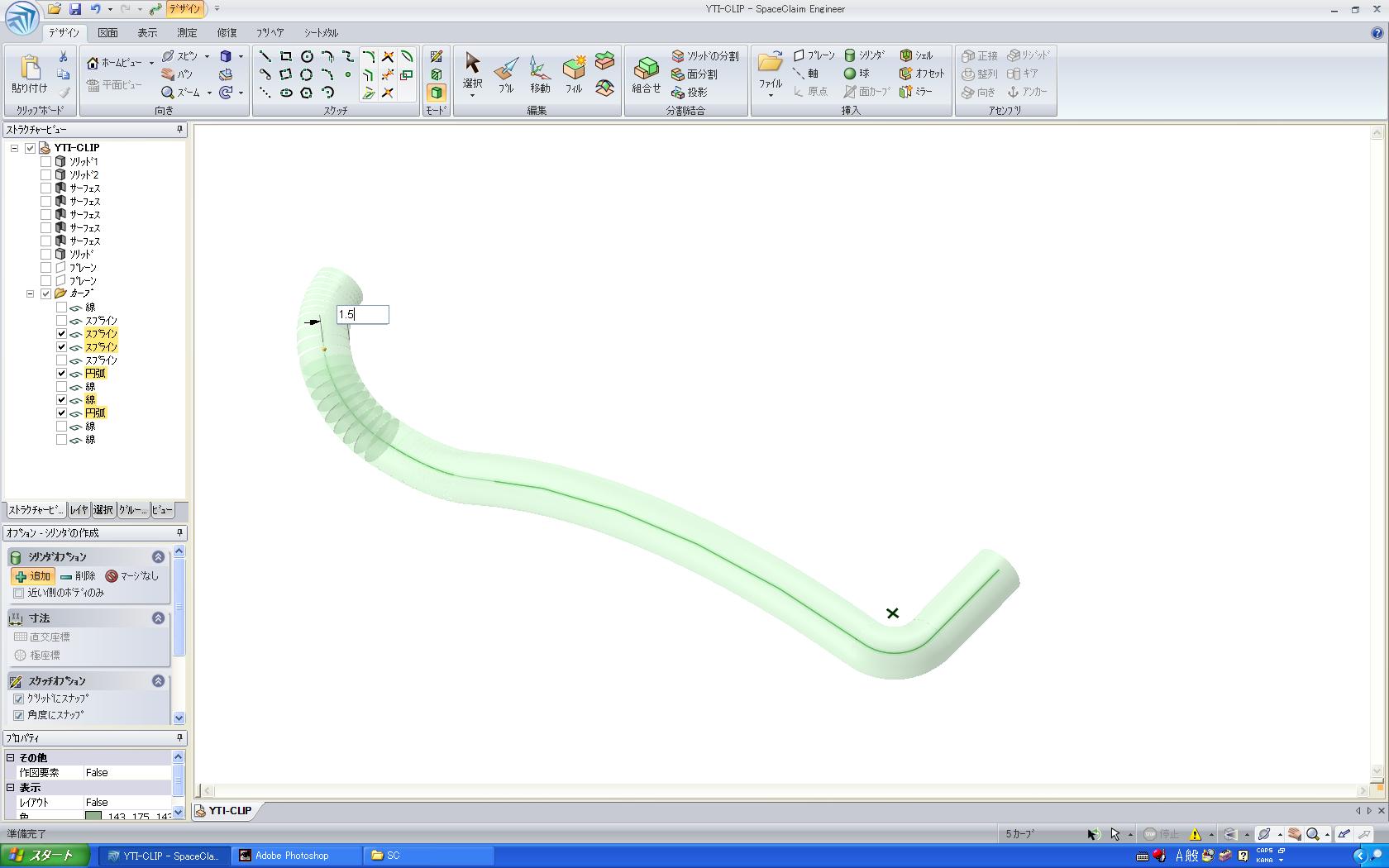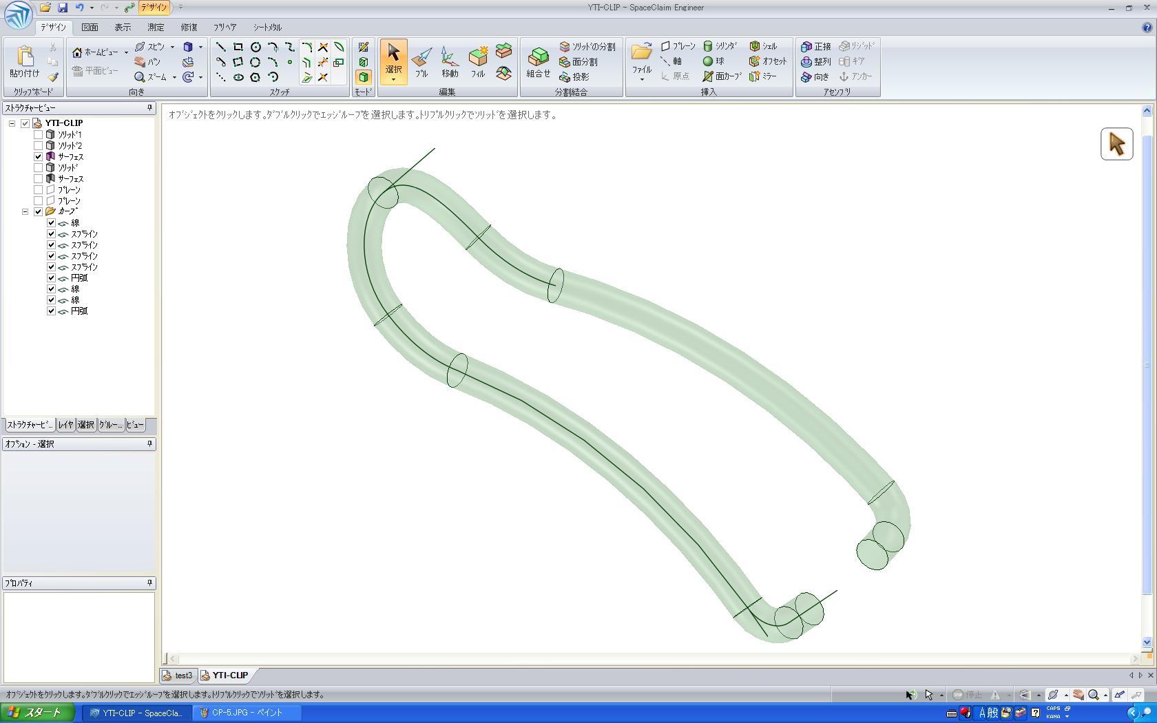 画像5:モードを2Dモードに切り替え、曲線の端点をクリックすると、その曲線に正対した座標に切り替わる。そこでスケッチの円ツールでワイヤーの断面となる円を定義し、3次元モードで、編集‐プルで円を選択、オプションの「曲線に沿って」で起動ラインを選択するとワイヤークリップの半分ができる。挿入−ミラーで反対側を作る(クリックで拡大)