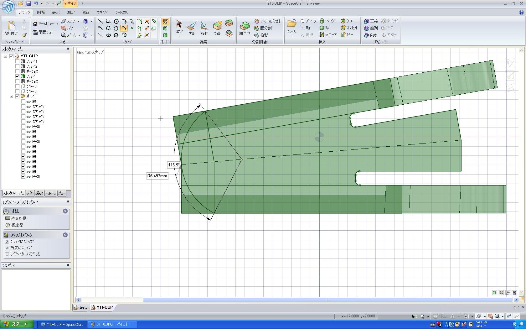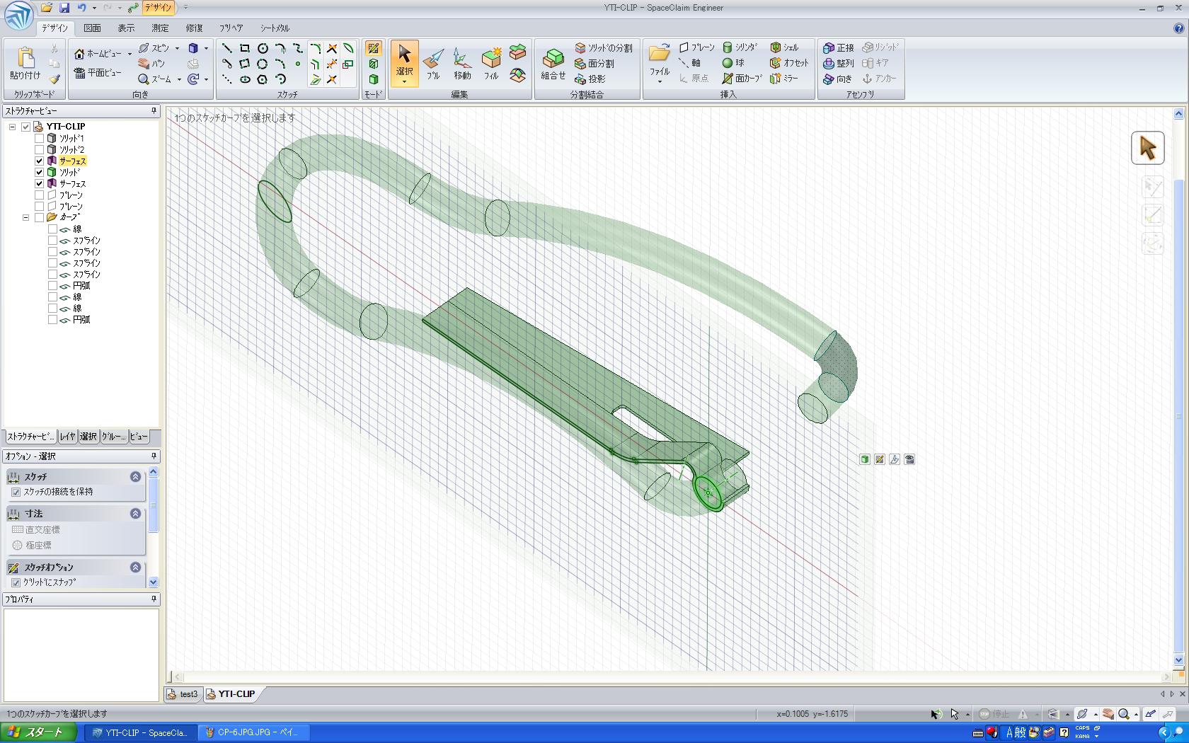 画像1:まず空間上に3次元的に曲がったワイヤークリップの軌道ラインを定義する。一般的なCAD同様、スケッチツールは1つの座標上にしか曲線を定義できないので、1つの曲線を描いた後に座標を回転移動してもう1つの曲線を定義する(クリックで拡大)