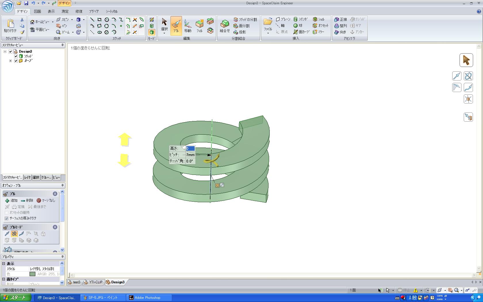 画像2:3Dモードでプル。プルモードを回転にしてオプションのヘリカルを選択し、ピッチを入力(クリックで拡大)