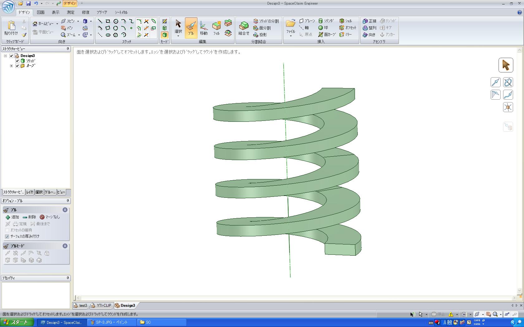 それと例えば異型断面のコイル、バネなどのモデリングで用いる螺旋形状ですが、これまでのCADですと、一度で作ることができず、その都度螺旋カーブを定義してから、90度づつエッジのラインをコピーして貼り付けていかなければいけませんでした。これがSpaceClaimですとプルコマンドの「ヘリカルカーブを作る」という機能で簡単に行えます。機構設計などで、圧縮状態、自由長状態のスプリングを仕込む場合など非常に便利ですね。これは相当な時間の短縮になります。