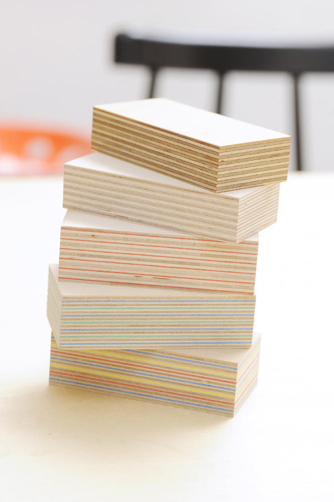 毎月、挟みたい素材を持って集まるワークショップを行っていて、アクリル、樹脂系、布系、発泡剤とかいろいろなものを挟んだ中で、偶然印刷所で分厚い、小口まで色の入った紙を見つけたんです。その紙を挟んでみたらかなりいい。新しい使い方、可能性を想起させるんです。これまでの合板は、小口をいかに隠すかという発想でしたが、逆に小口をどう見せるか。どういうふうにカットしたら面白い見え方がするかとか、そういうことを想起させる新しい素材が作れるんじゃないかというので。これは「Paper-Wood」の名称で商品化されました。