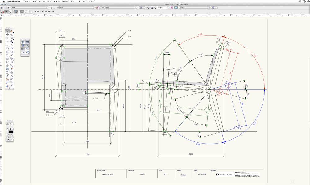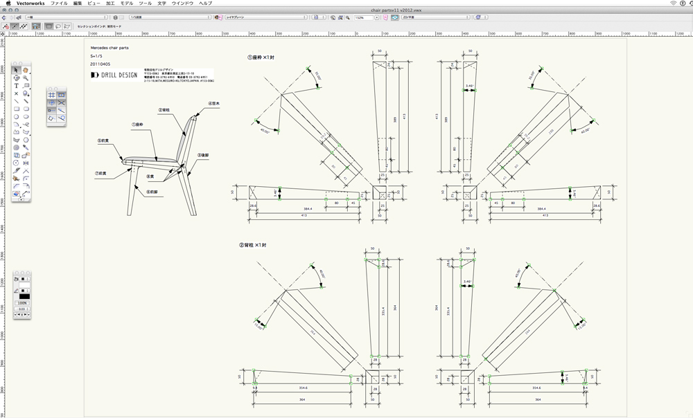 林:例えばメルセデス・ベンツ コネクションのために作った椅子などはVectorworksでないと書けない感じでした。この椅子は三方継をしているんですけど、継ぎ目の角度をピシッと合わせるとかはVectorworksがいいですね。また、VILLAGEという椅子の図面では、パーツが細かくて、穴の開け方とかも21度振ったところに23.5度の穴を開けてくださいといった指示が入ります。