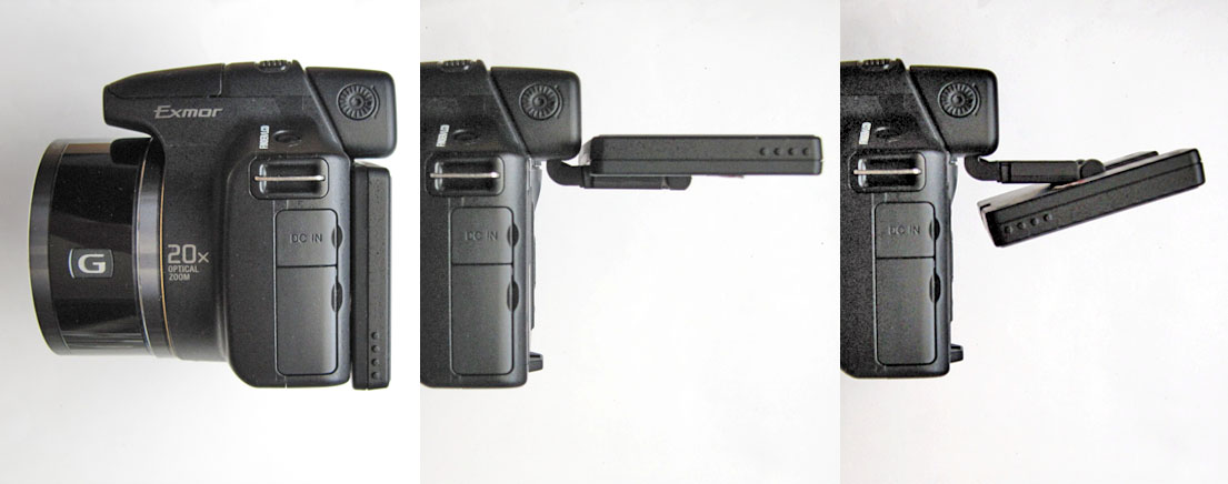 背面の3.0型クリアフォト液晶は、バリアングルタイプ。液晶面の角度を、上向きに90度(中)、下向きに約80度まで変更することができ、カメラの高さによらず構図を楽に決めることができる(クリックで拡大)
