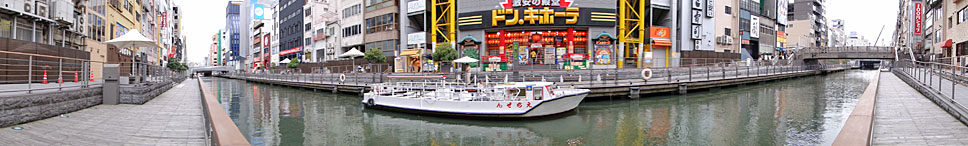 これが「スイングパノラマ」の威力。実際には水路(道頓堀川)も遊歩道も一続きの直線状だが、水平方向に224度(最大値)の視野を1枚の平面に収まるパノラマ写真ではあたかもV字型に屈曲しているかのように写っている(クリックで拡大)