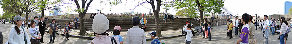 大道芸の観客たちの中に入って撮影したもの。視野内に移動中の物体があると、レンズの移動方向に伸縮(もしくは分割)して写ることがあるが、このように静止したシーンは一瞬で全視野が撮影されたかに見える(クリックで拡大)