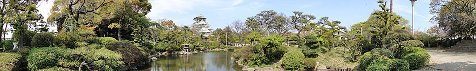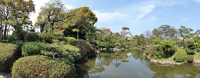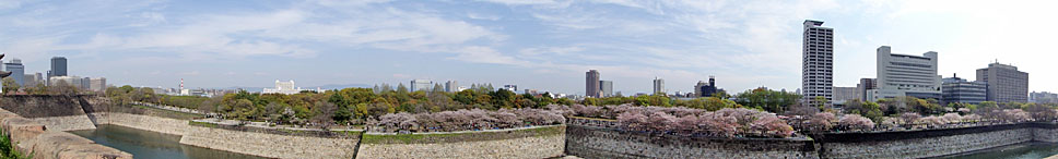 桜満開の大阪城のお堀端を「スイングパノラマ」で捉えてみた。被写体を選ぶものの、こうしたパノラマ写真が1回の連続撮影で気軽に楽しめるようになったことの意義は大きいといえる(クリックで拡大)