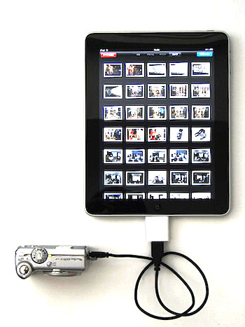 同じく、専用オプションのiPad Camera Connection Kitに含まれるUSBケーブルドングルを利用してデジタルカメラを接続したところ。どちらの方法を使っても、快適にフル解像度のイメージデータ(ムービーデータ含む)をiPad内に取り込むことができる(クリックで拡大)