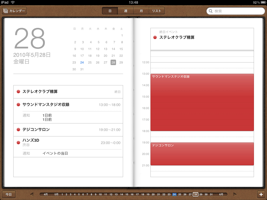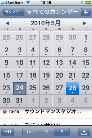 標準で内蔵される純正アプリも、iPad用にインターフェイスデザインなどが一新されている。例えば、カレンダー(スケジューラー)アプリは、iPhoneでは月表示や日表示などをモードによって使い分けることで小さな画面を有効活用しているが…(クリックで拡大)