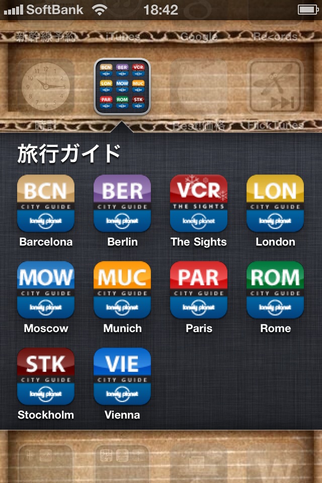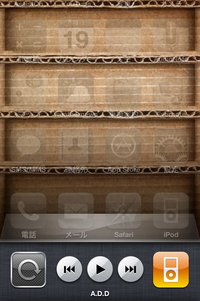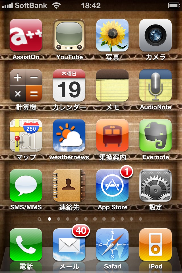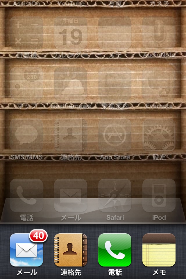 この図をコンピュータ上で見ても実感できないが、標準アプリやiOS 4対応アプリのアイコンはレティナディスプレイに合わせて高解像度化されている(ボール紙の棚の壁紙は、非純正のイメージを使用)(クリックで拡大)