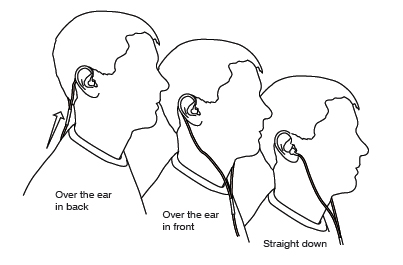 ステージパフォーマンスなどの激しいアクションでも脱落しない確実な装着のために、ケーブルを耳の上から後ろに回すオーバー・ザ・イヤースタイル(左の2つ)は「シュア巻き」とも呼ばれる。ケーブルは耐久性のあるケブラー素材で、耳の後ろにあたる部分は肌触りが良く汗に強いプラスティックコーティングされている