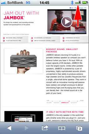アップルの技術協力により、Bluetooth接続されたiPhoneの画面には、JAMBOXの充電量のインジケータ(赤い矢印部分)が表示される。この機能がサードパーティ製品に開放されたのは、JAMBOXが初めてだ(原稿執筆の時点では、iPadはこの表示機能に対応していない)(クリックで拡大)