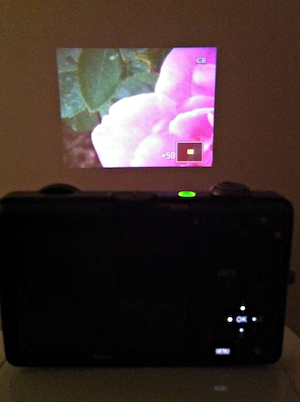 操作面のインターフェイスはニコンのコンパクトカメラの標準的なもので、普通に使いやすい。右上の赤丸付きのスイッチは動画専用の撮影ボタン。プロジェクター使用時には、投影操作に必要なボタンが点灯する