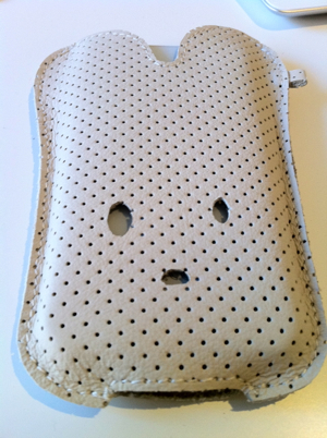 デザインユニットSetoによる牛革(裁断済自動車用シートレザー)製iPhoneケース「Umiushi」(3,200円)。柔らかい革で固いiPhoneを守る構造を、柔軟な体の内部に硬質な殻を持つウミウシに見立てた製品で、左端と右端のほぼ正方形のものが販売時の形状である