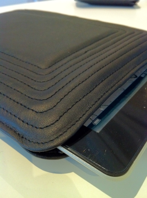 ゴーマルイチデザインスタジオによる牛革(同上)製のiPadケース「stitch」(9,200円)。その名の通り、刺し子にヒントを得た縫いを施すことで、道着の帯のようなクッション製と強度を持たせ、それが視覚的な特徴ともなった。同種デザインのiPhoneケース(4,700円)もある(クリックで拡大)