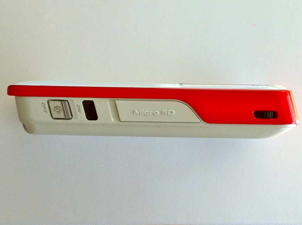 右側面には、写真左からメインの電源スイッチ、別売りのリモコン用赤外線受光部、マイクロSDスロット、そして赤い部分の右端にプロジェクターのフォーカスノブがある。(クリックで拡大)