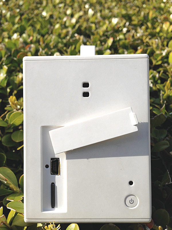 側面パネルには、メインの電源ボタンとその上に充電状態を示すインジケーター、そしてカバー内に充電用のUSBポート(75分でフル充電)、リセットボタン、microSDカードスロットがある。上部の2つの穴はストラップホール。(クリックで拡大)