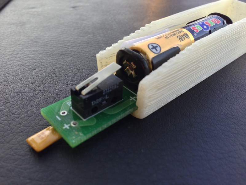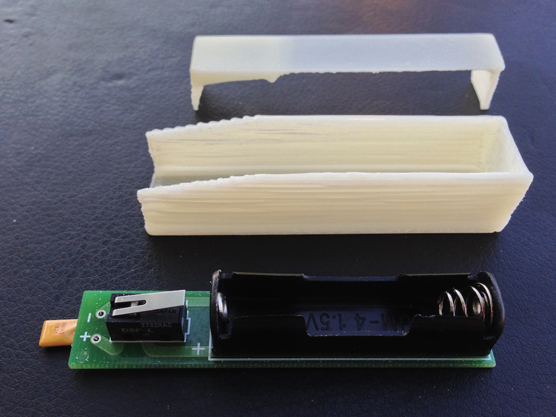 ただし、完成品の外観は、むき出しの基板+電池ボックスで、持ち歩く際にも、不用意にスイッチが入ってしまう可能性がある。そこで、携帯時に便利なケースを3Dプリンタで「製造」しようというわけだ。。
