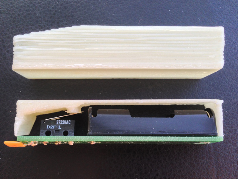 ケース本体とカバーを一体化したところ。基板が奥まで差し込まれていると、カバーを指で上から押した際に、裏の突起が内部スイッチに当たり、電流が流れる。(クリックで拡大)