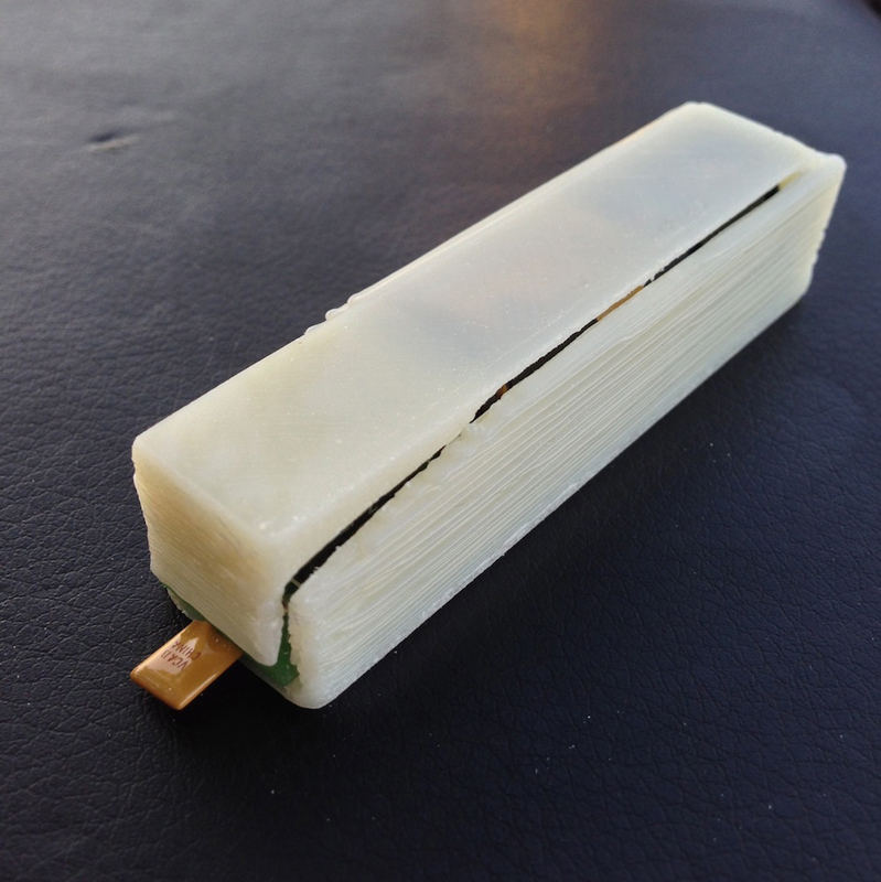 そこで3DプリンタのPrintrbotで「製造」してみたのが、2ピース構成の自作の専用ケースである。(クリックで拡大)