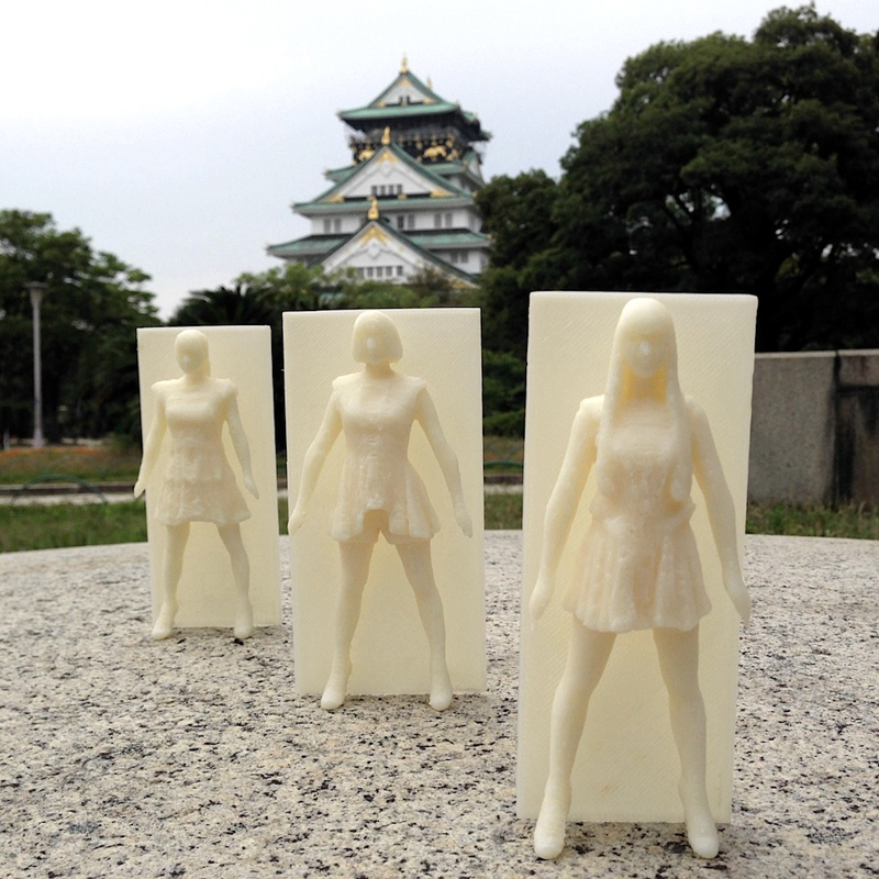Perfumeのプロモーションの一環として同グループのグローバルサイトからダウンロードでき、非営利目的の二次利用が自由に行える3Dスキャンデータを変換して、3Dプリンタで出力したフィギュア。こうした流れをたとえば電子書籍と融合させれば、コンテンツがボタン1つで実体化するアイドル写真集や昆虫図鑑のようなものも遠からず実現していくだろう。(クリックで拡大)