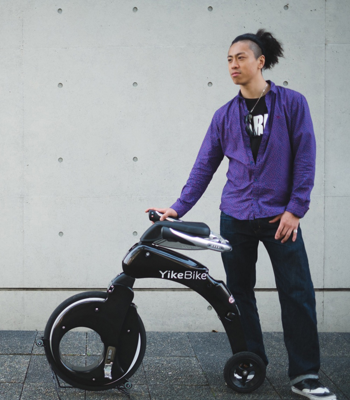 折りたたんだ状態のYikeBike。小径の後輪が大径の前輪の内部に収まるなどの巧みなアイデアにより、塊感のあるまとまった形に折りたたまれる。(クリックで拡大)